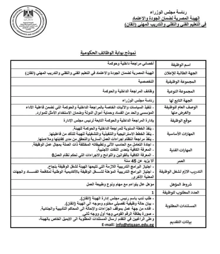 كشفت الهيئة المصرية لضمان الجودة والاعتماد في التعليم الفني والتقني والتدريب المهني «إتقان»، التابعة لرئاسة مجلس الوزراء، عن فتح باب التقديم على وظيفة أخصائي مراجعة داخلية وحوكمة.