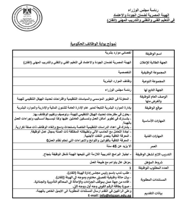 أعلنت الهيئة المصرية لضمان الجودة والاعتماد في التعليم الفني والتقني والتدريب المهني إتقان، التابعة لرئاسة مجلس الوزراء، عن حاجتها لتعيين أخصائي موارد بشرية.