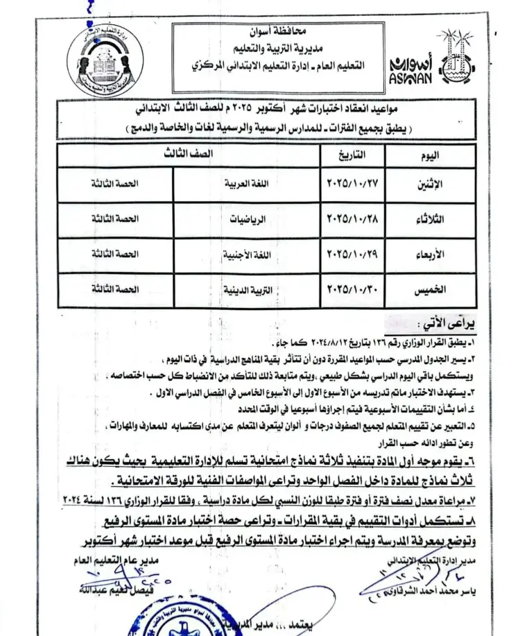 جدول امتحانات شهر أكتوبر للصف الثالث الابتدائي محافظة أسوان 2025