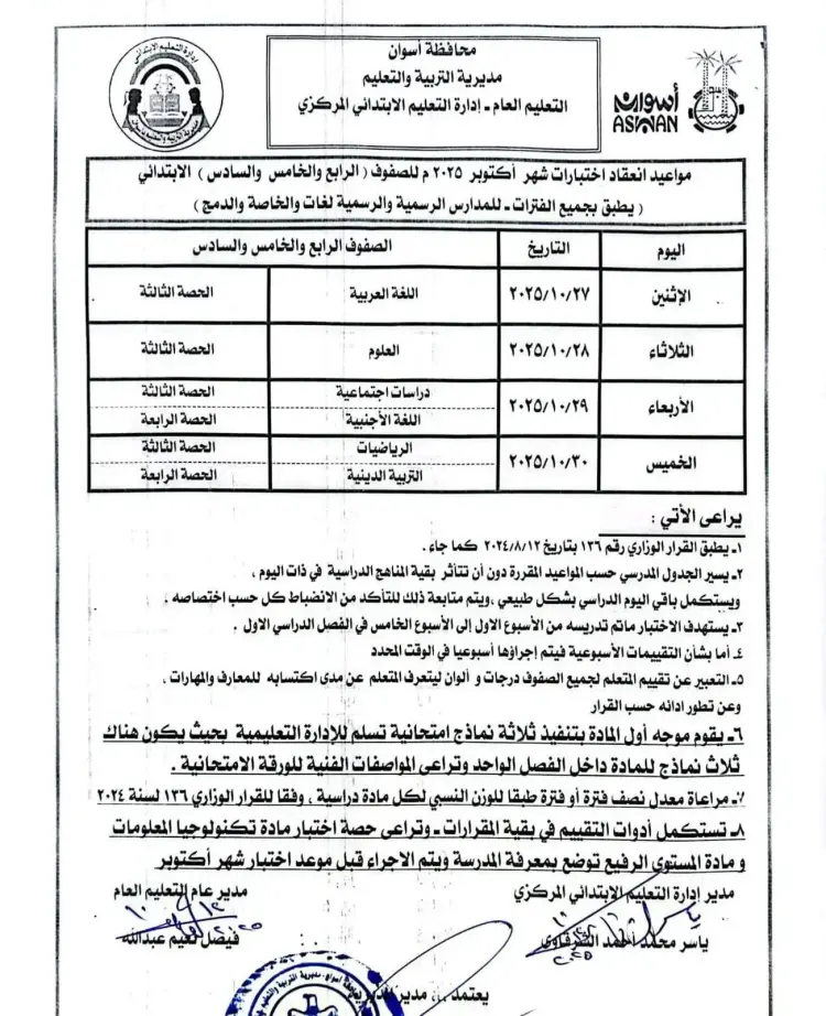 جدول امتحانات شهر أكتوبر للصف الرابع الابتدائي محافظة أسوان 2025