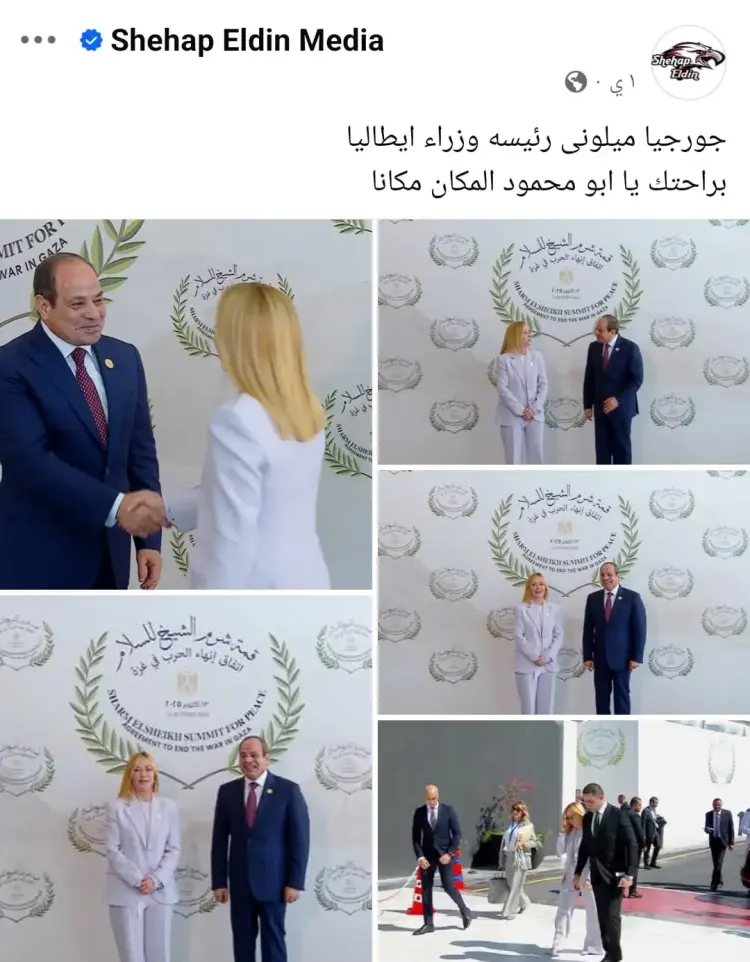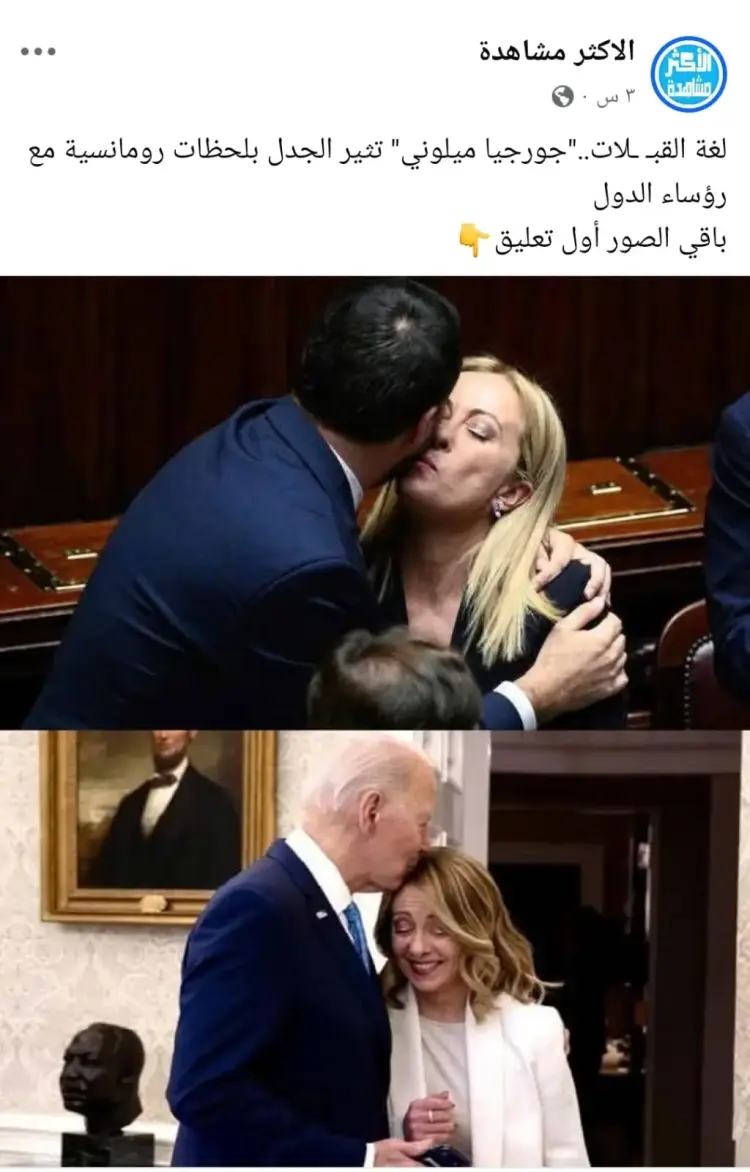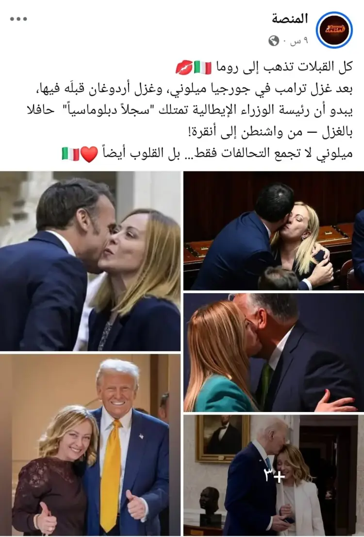 تداول رواد مواقع التواصل الاجتماعي صورا مركبة تظهر جيورجيا ميلوني إلى جانب الرئيس الأمريكي السابق دونالد ترامب، والرئيس التركي رجب طيب أردوغان، والرئيس الفرنسي إيمانويل ماكرون، معتبرين انها أصبحت صاحبة لغة القبلات التي أثارت الجدل بظهورها الأخير في قمة شرم الشيخ للسلام.