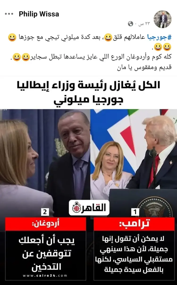 تداول المستخدمون مقطع فيديو فكاهي، يعتمد على دمج مقطع صوتي لإحدي المسرحيات المصرية مع فيديو مغازلة ترامب لميلوني أثناء مصافحتها، ويكأنها تقول له: «متهزرش معايا هزار جامد».