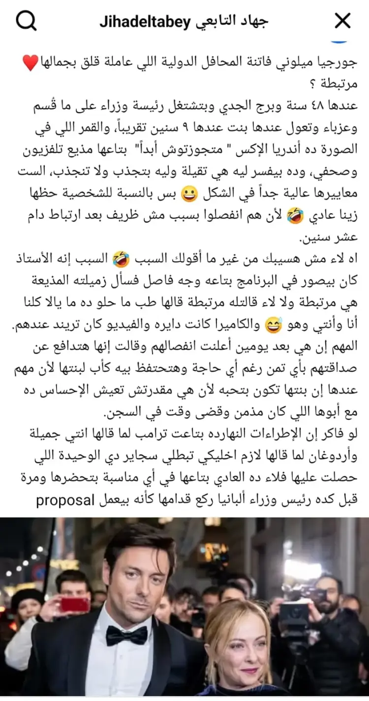 وعلقت إحدى المدونات «جهاد التابعي» قائلة: «جورجيا ميلوني فاتنة المحافل الدولية اللي عاملة قلق بجمالها».