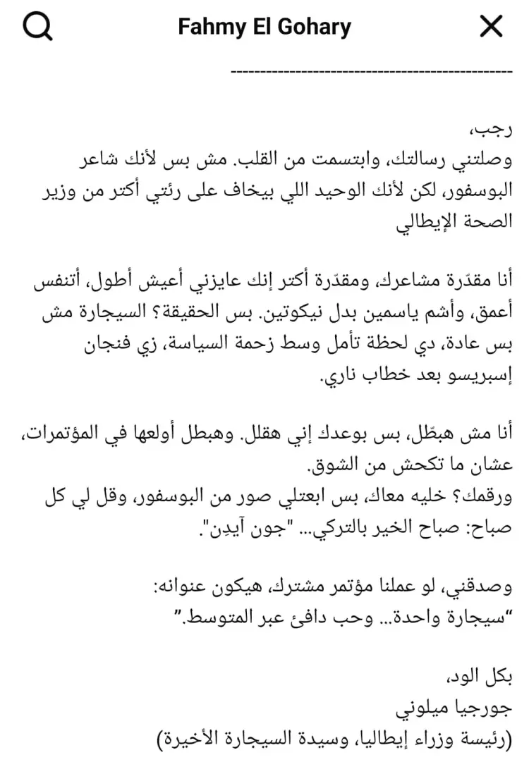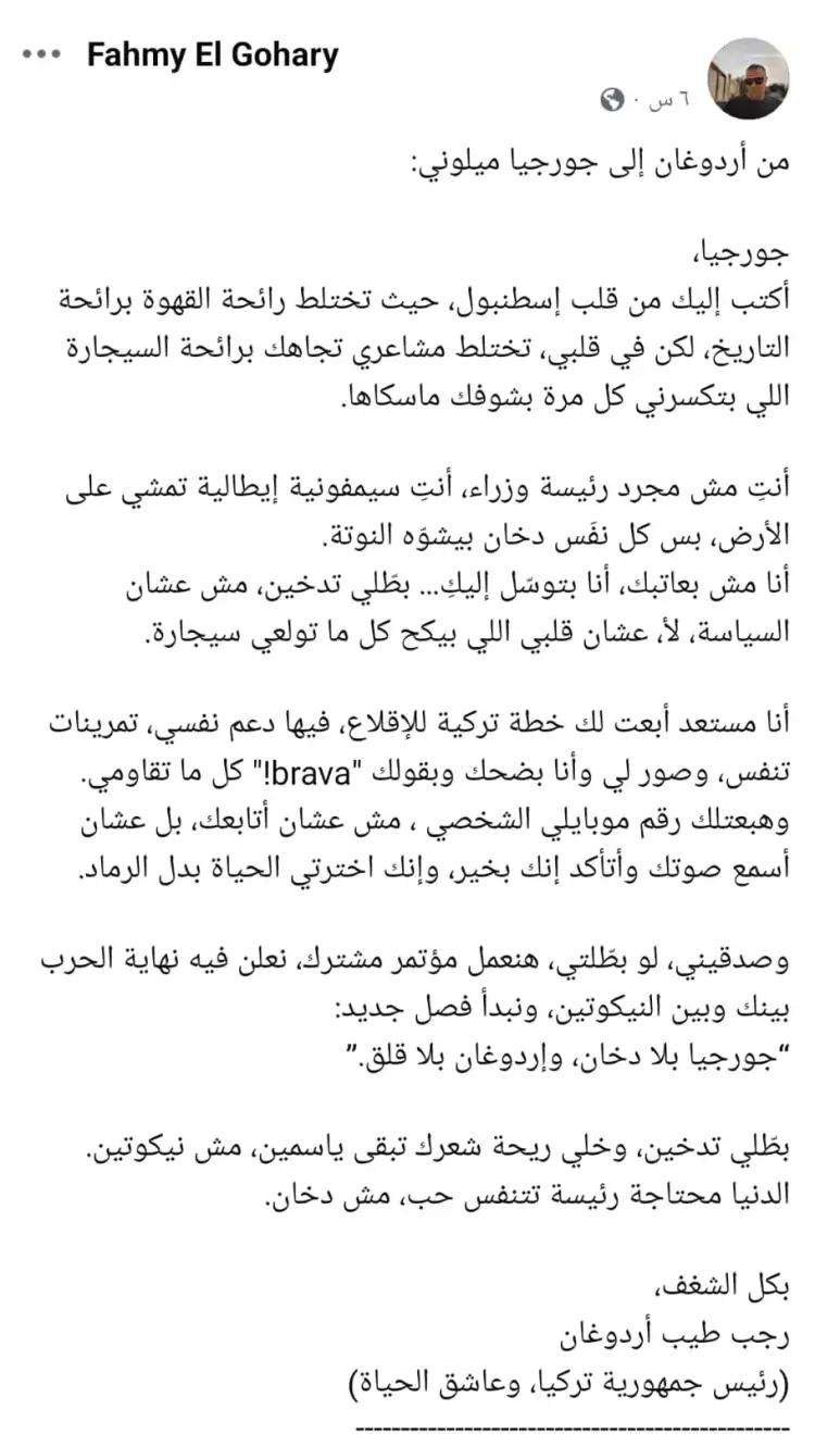 ولم يقتصر الأمر على المزاح، بل تطرق للإبداع حيث ابتكر صاحب حساب فهمي الجوهري رسالة من نسج خياله ونسبها للرئيس التركي رجب طيب أردوغان، فيها: «أكتب إليك من قلب إسطنبول.. بطلي تدخين، وخلي ريحة شعرك تبقى ياسمين، مش نيكوتين، الدنيا محتاجة رئيسة وزراء تتنفس حب، مش دخان».