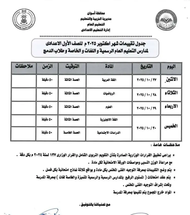 أعلنت مديرية التربية والتعليم بمحافظة أسوان، ممثلة في إدارة التعليم الإعدادي، عن جدول تقييمات شهر أكتوبر للصف الأول الإعدادي للعام الدراسي 2025 2026.