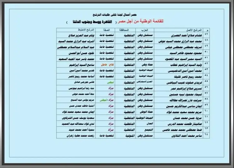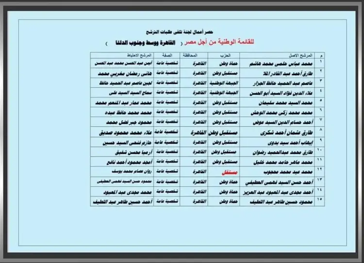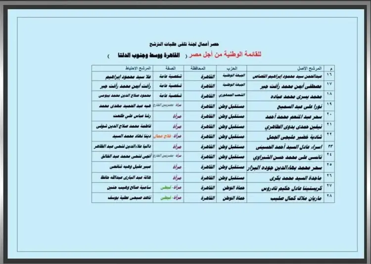أسماء مرشحين القائمة الوطنية في القاهرة 2025