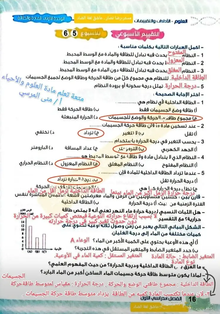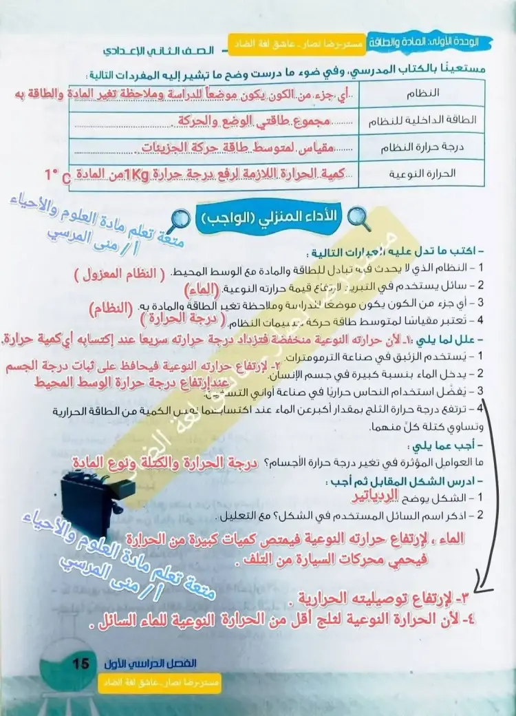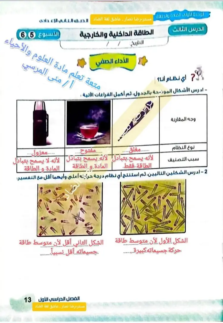 بدأ المعلمون في نشر نماذج حل أداءات وتقييمات مادة العلوم للصف الثاني الإعدادي، والتي تغطي الأسبوعين الخامس والسادس الدرس الثاني بعنوان «الطاقة الداخلية والخارجية» ضمن الوحدة الأولى «المادة والطاقة»، والتي تهدف إلى ترسيخ فهم الطلاب للمفاهيم الأساسية المتعلقة بحالات المادة وخصائصها.