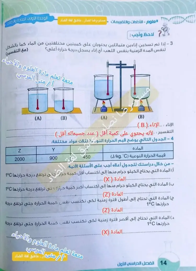 ب) حدد المتغير الضابط والمتغير المستقل في هذه التجربة؟ المتغير الضابط: حالة المادة. المتغير المستقل: كمية الماء في الأوعية.