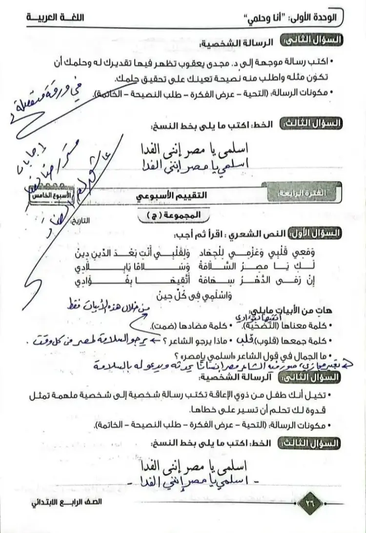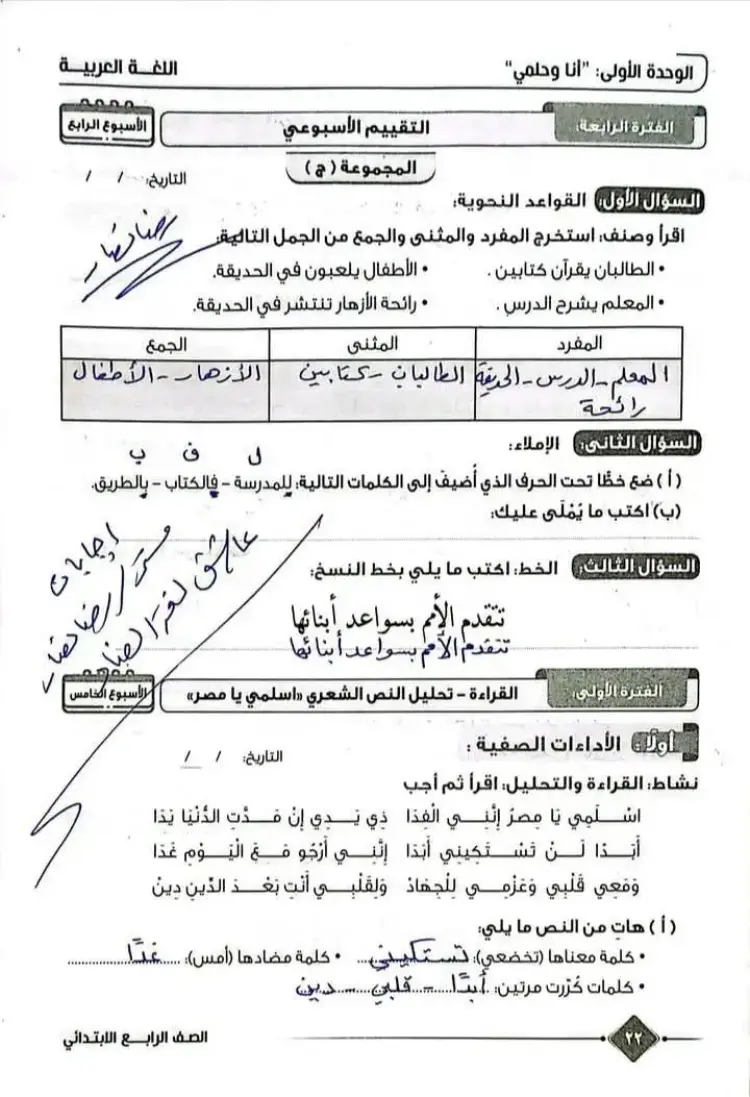 حل التقييم الأسبوعي عربي رابعة ابتدائي الأسبوع الخامس ترم أول 2026