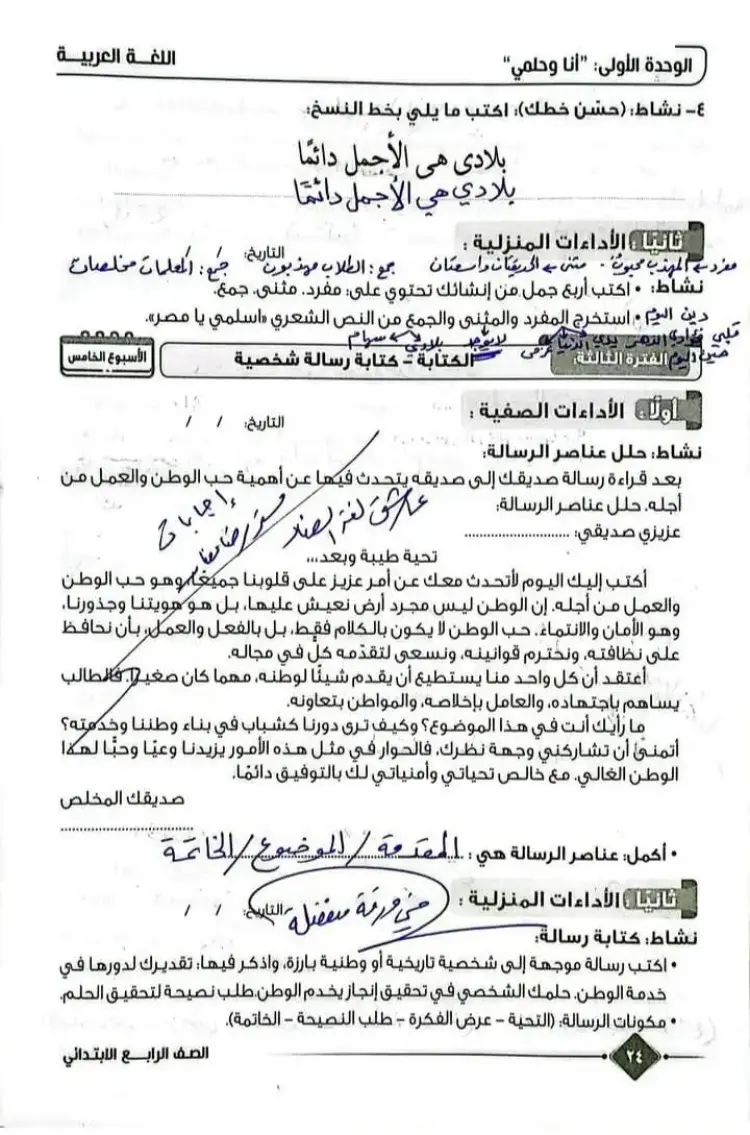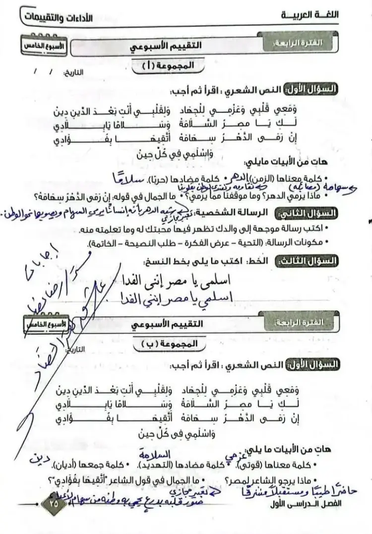 حل الأداء الصفي وواجب وتقييم الأسبوع الخامس عربي للصف الرابع الابتدائي ترم أول 2026