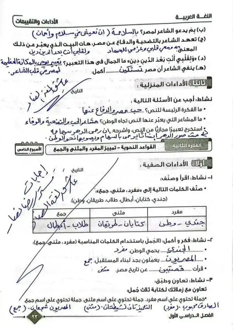 • ج١: «كتابان»: مثنى، «وطن»: مفرد، «أبطال»: جمع.