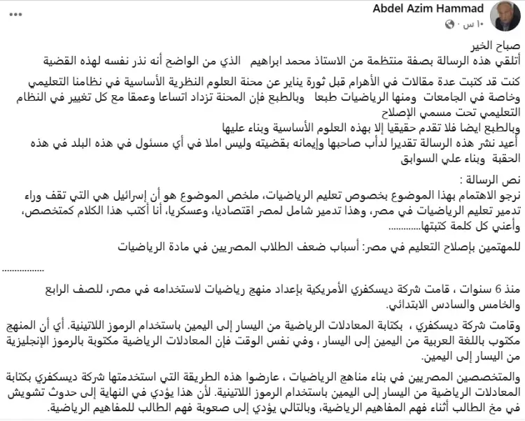 نشر رئيس تحرير صحيفة الأهرام سابقا، الكاتب الصحفي عبد العظيم حماد، نشر رسالة تلقاها من متخصص في علم الرياضيات يدعى محمد إبراهيم، تتهم إسرائيل بالوقوف وراء «تدمير ممنهج» لتعليم الرياضيات في مصر، بهدف إضعاف البلاد اقتصاديا وعسكريا على المدى الطويل.
