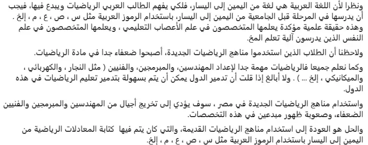 وتؤكد الرسالة أن هناك حقيقة علمية يدعمها متخصصون في علم الأعصاب التعليمي وعلم النفس، مفادها أن الطالب العربي يفهم الرياضيات ويبدع فيها بشكل أفضل عندما يدرسها بالاتجاه المتوافق مع لغته، أي من اليمين إلى اليسار وباستخدام الرموز العربية التقليدية مثل «س، ص».