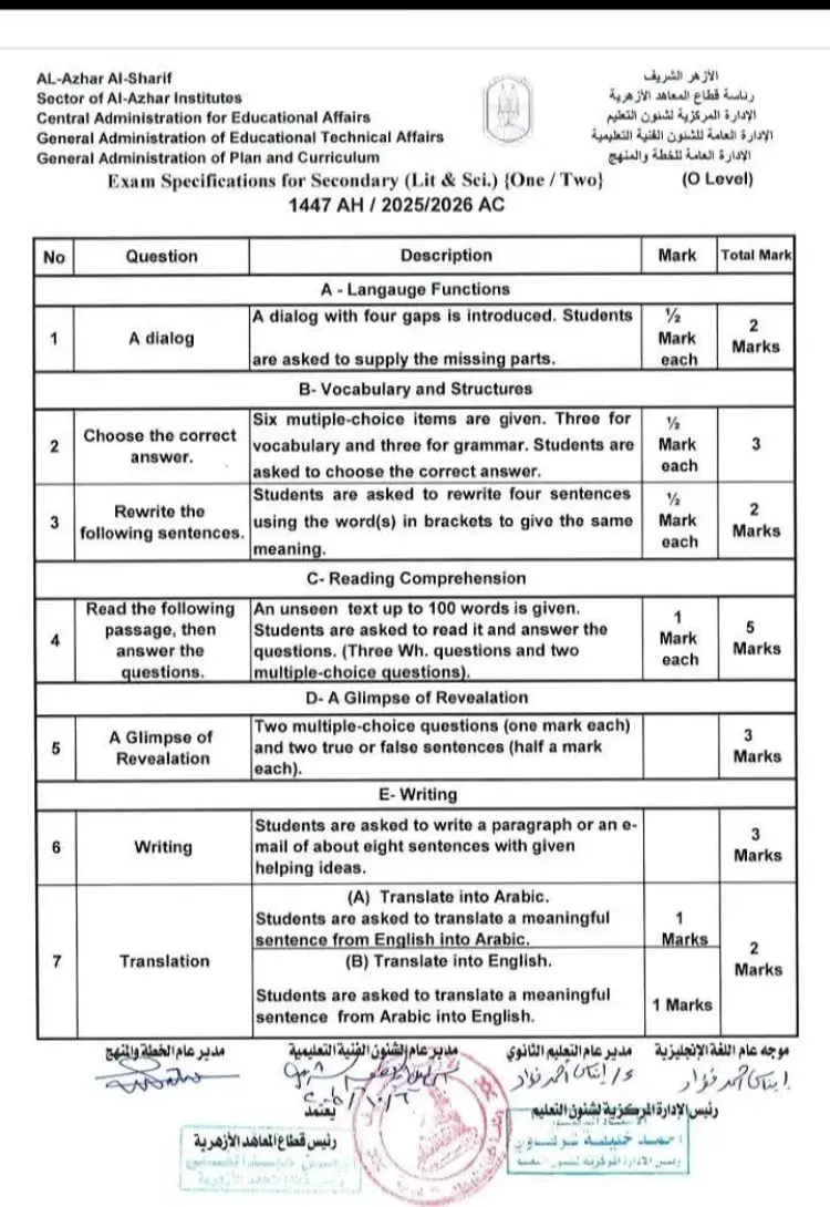 ولمتابعة مواصفات امتحانات اللغة الانجليزية أزهر للمرحلة الثانوية 2026 يمكنك الإطلاع على كافة التفاصيل في الصورة التالية: