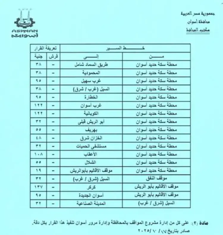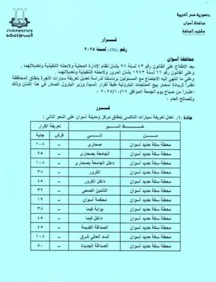 مادة (1): تعديل تعريفة سيارات التاكسي داخل نطاق مركز ومدينة أسوان وفق الأسعار الجديدة المعتمدة رسميًا.