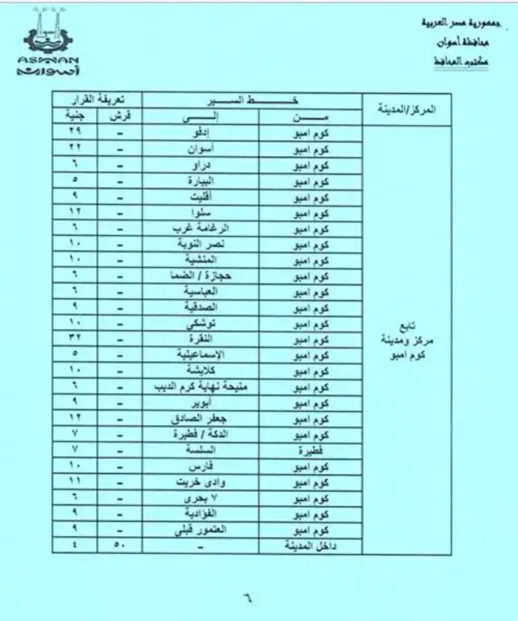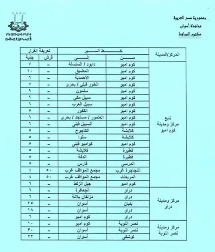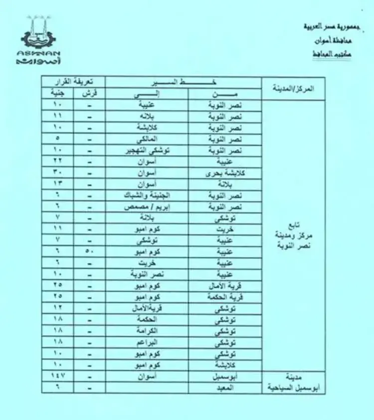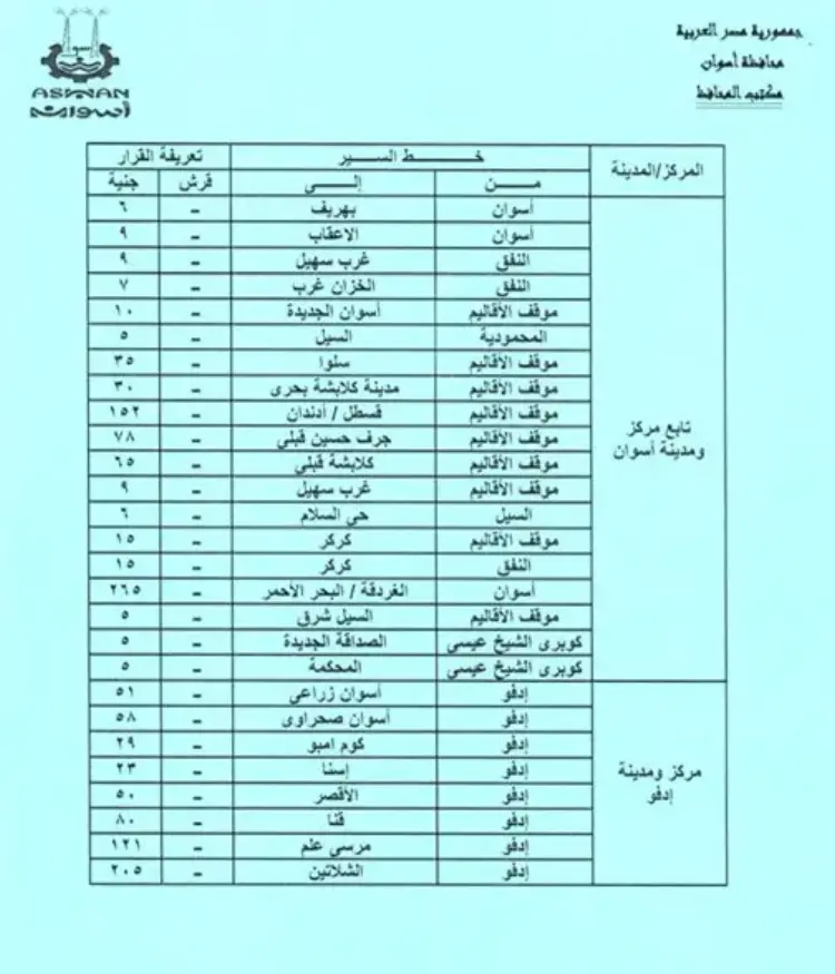 لمتابعة باقي أسعار المواصلات من وإلى مدينة أسوان يمكنك الإطلاع على الصور التالية: