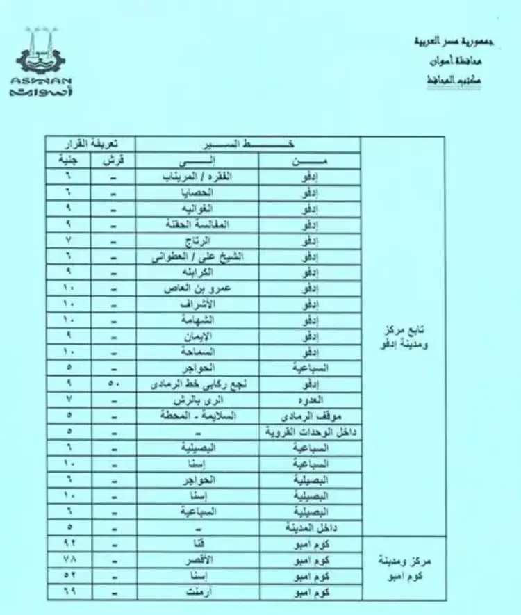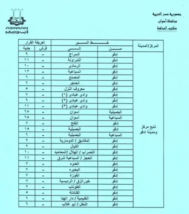 من موقف الأقاليم بأبو الريش إلى أسوان الجديدة: التعريفة 95 جنيهًا.