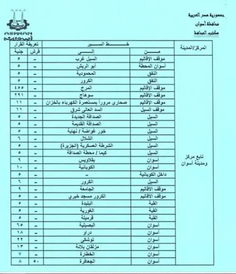 من محطة سكة حديد أسوان إلى السبيل (غرب / شرق): التعريفة 32 جنيهًا.