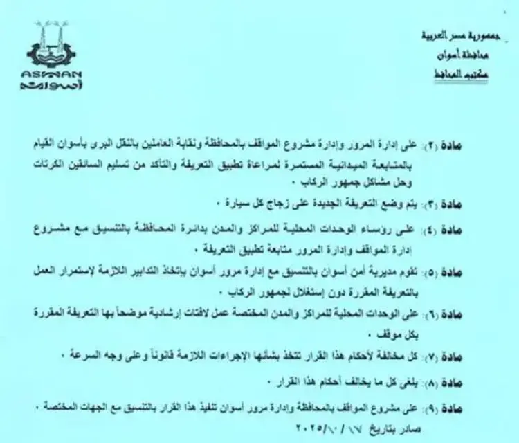 اعتمد القرار تنظيمًا دقيقًا لتطبيق التعريفة الجديدة داخل مركز ومدينة أسوان، مع تكليف إدارات المرور والمواقف والنقابة العامة للعاملين بالنقل البري بمتابعة التنفيذ ميدانيًا والتأكد من التزام السائقين بالتسعيرة الرسمية وتسليمهم الكروت المخصصة لذلك.