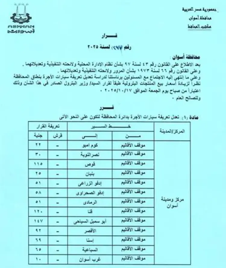 تعريفة المواصلات الجديدة في أسوان بعد زيادة البنزين أكتوبر 2025