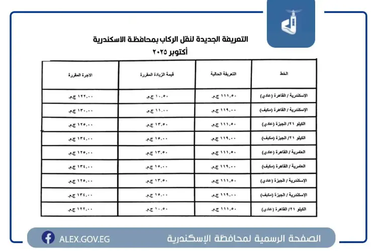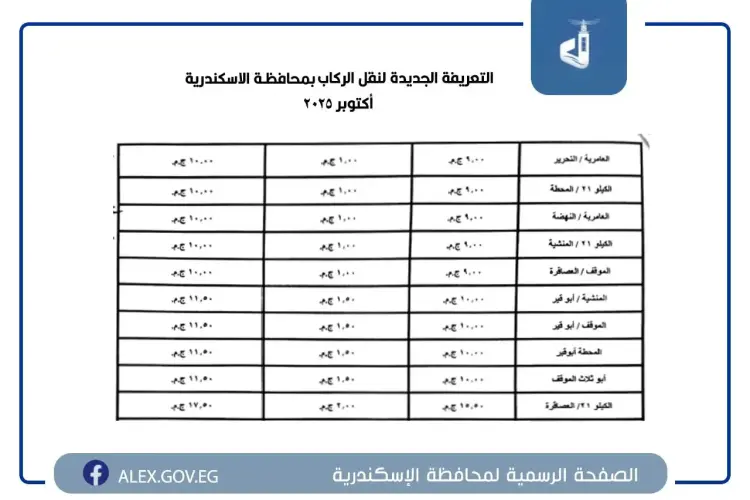 أعلنت محافظة الإسكندرية، اليوم الجمعة الموافق 17 أكتوبر 2025، عن تطبيق تعريفة الأجرة الجديدة لوسائل النقل العام والخاص داخل المحافظة، وذلك في أعقاب قرار لجنة التسعير التلقائي للمنتجات البترولية برفع أسعار الوقود على مستوى الجمهورية بدء من صباح اليوم.