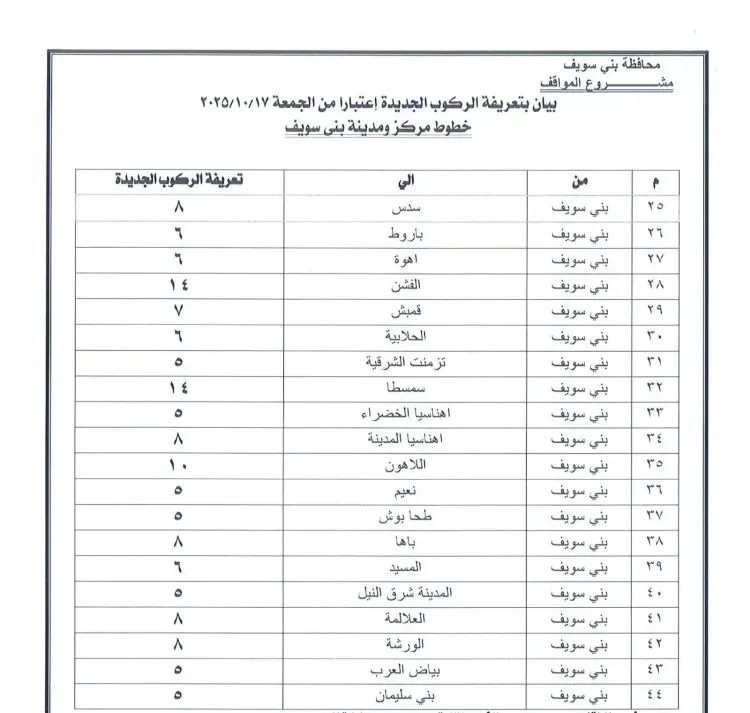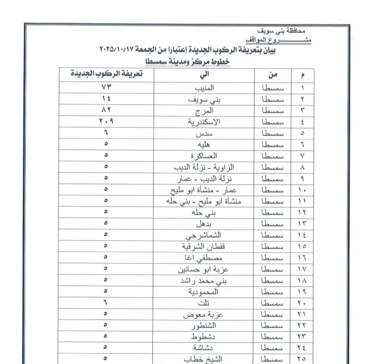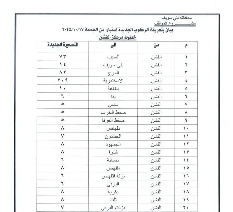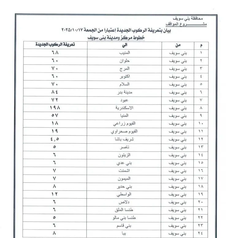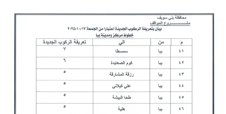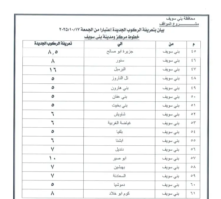 تعريفة الركوب الجديدة بعد زيادة البنزين بني سويف 2025 لجميع المناطق