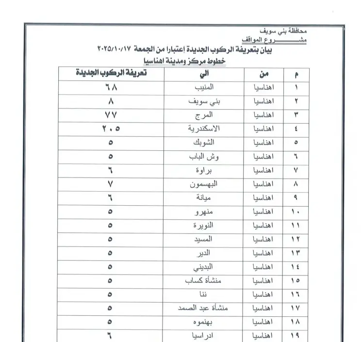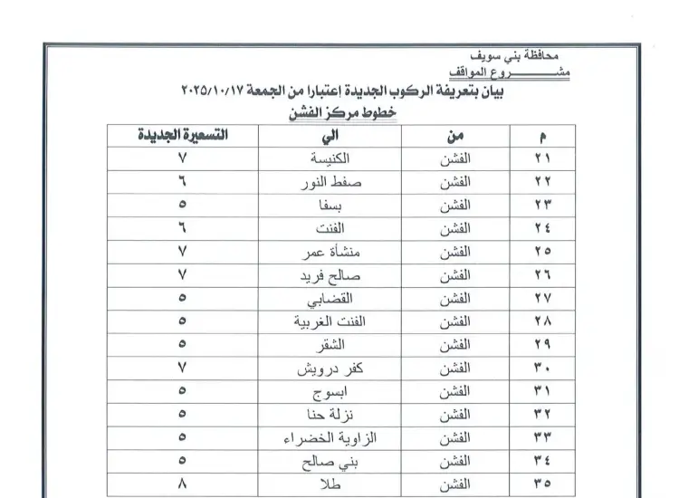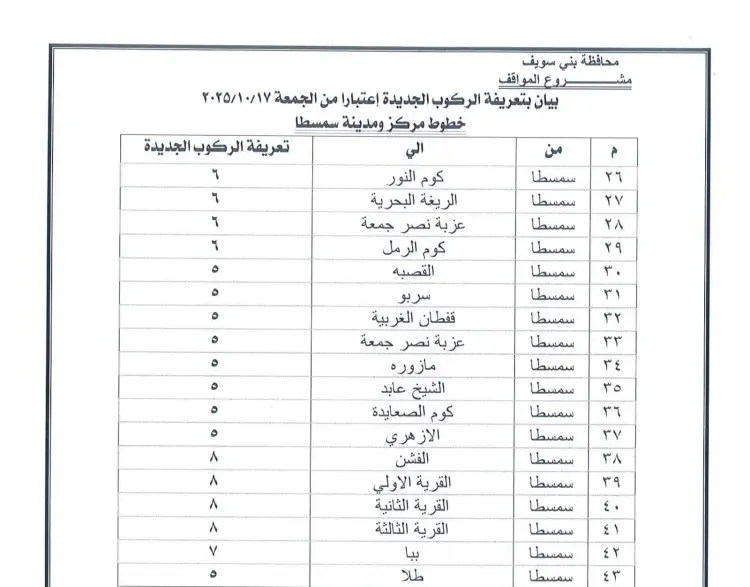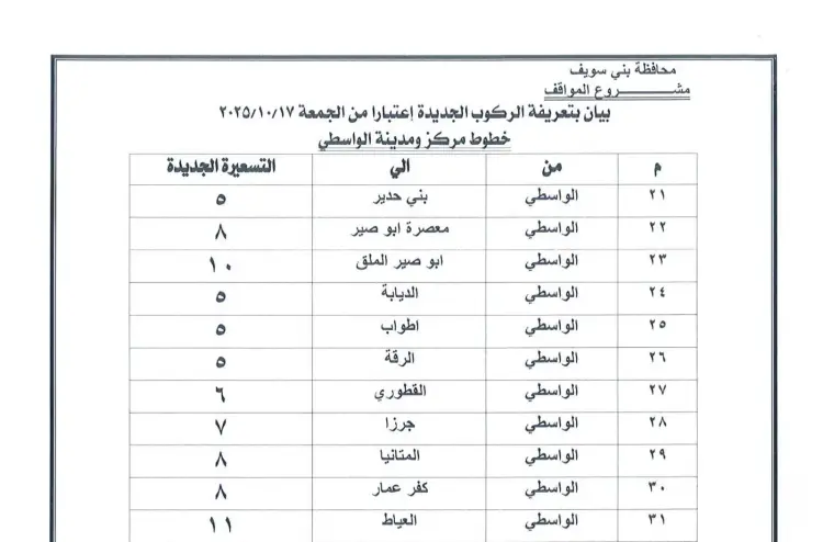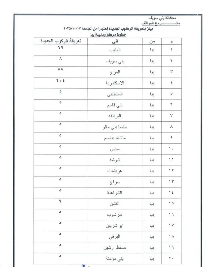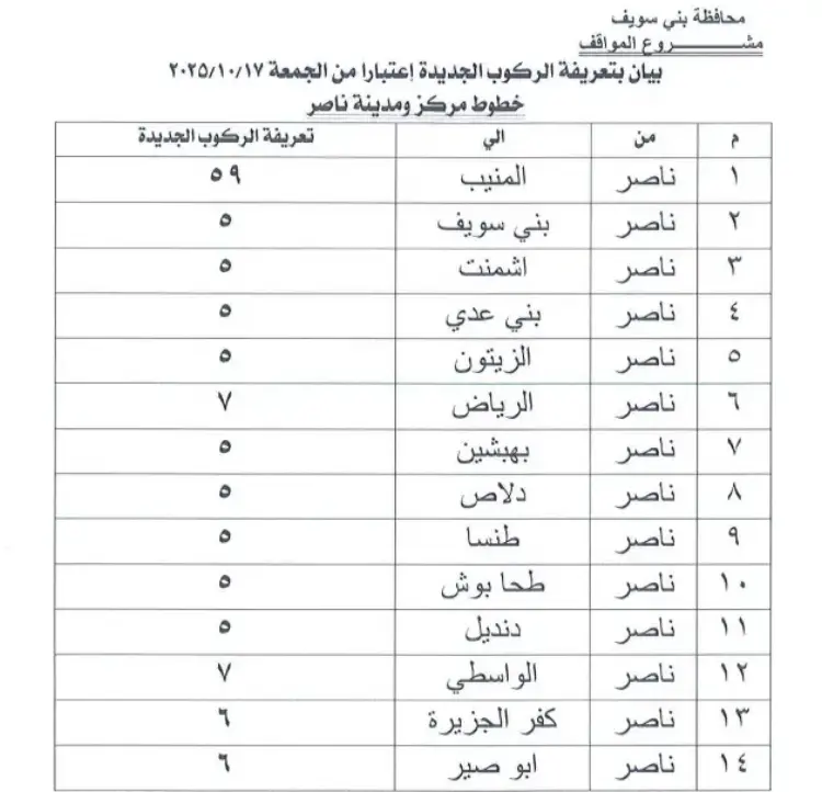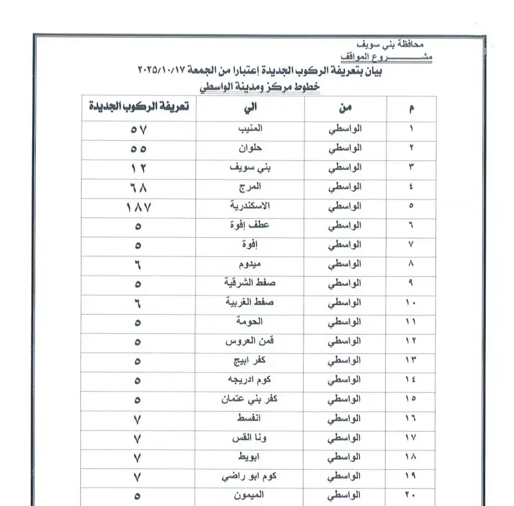 تعريفة الركوب الجديدة بعد زيادة البنزين بني سويف 2025 لجميع المناطق