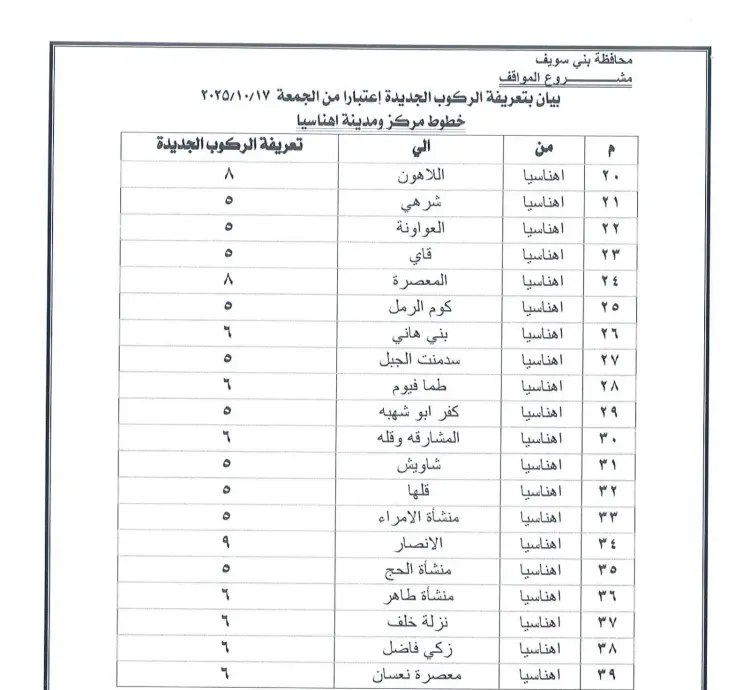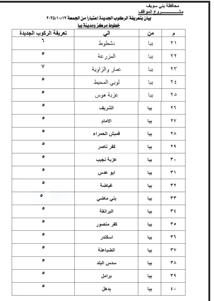 جاءت أسعار تعريفة الركوب الجديدة في بني سويف 2025 بعد الزيادة على النحو التالي: