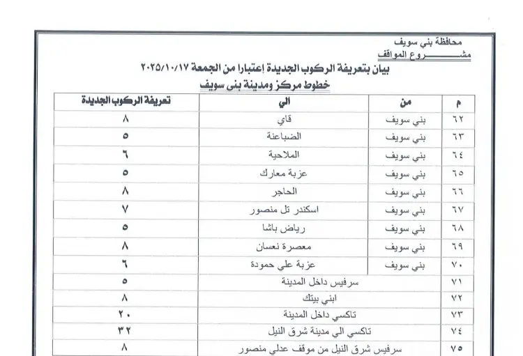 أعلنت محافظة بني سويف، تعريفة الركوب الجديدة بعد زيادة البنزين، كي يتعرف عليها جميع الركاب قبل التوجه إلى أي مكان.