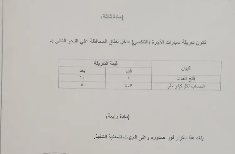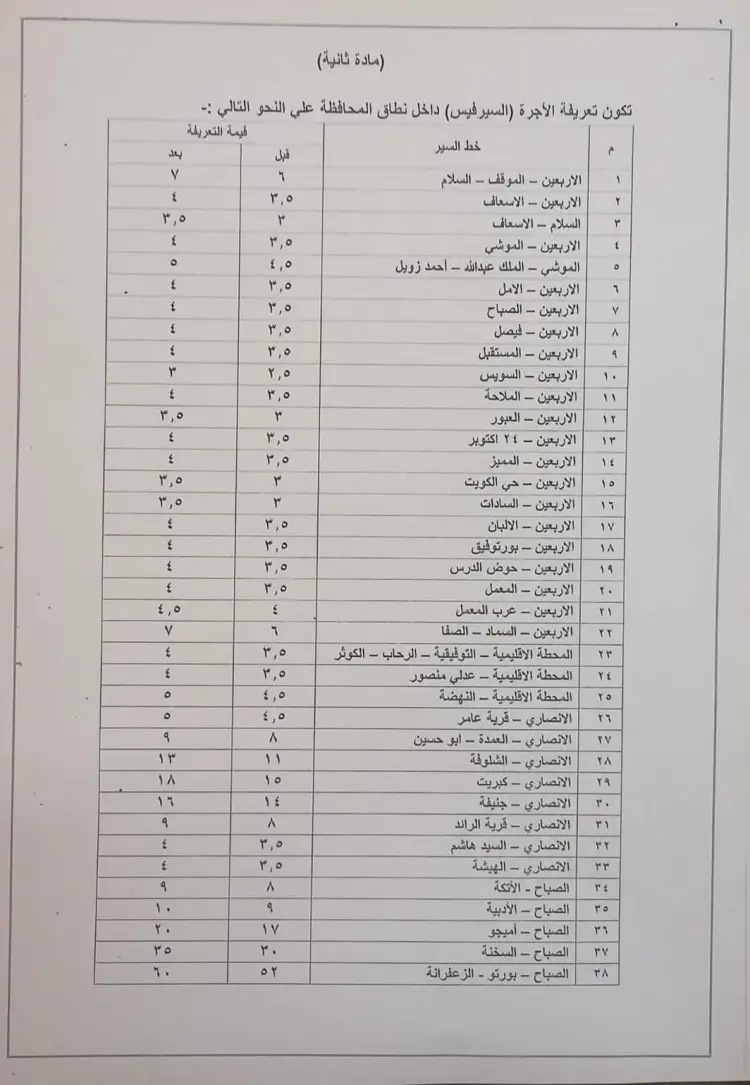 شدد المحافظ، على ضرورة التزام السائقين بالتعريفة الجديدة وعدم إستغلال المواطنين، والتي جاءت على النحو التالي:
