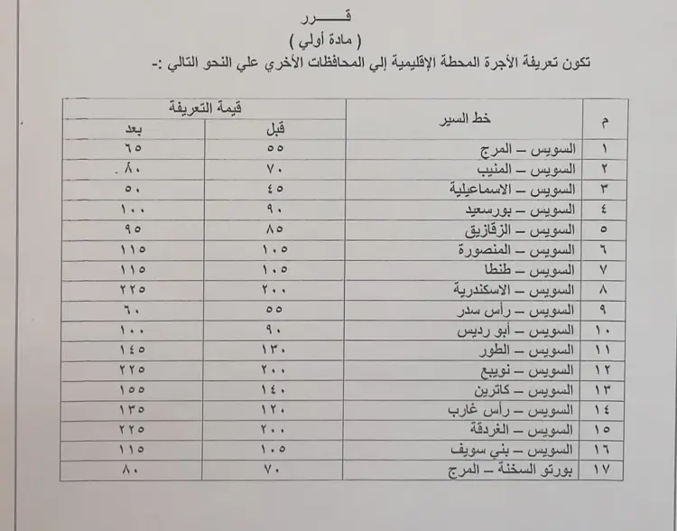 تعريفة الركوب الجديدة بالسويس 2025 بعد زيادة أكتوبر لجميع المناطق