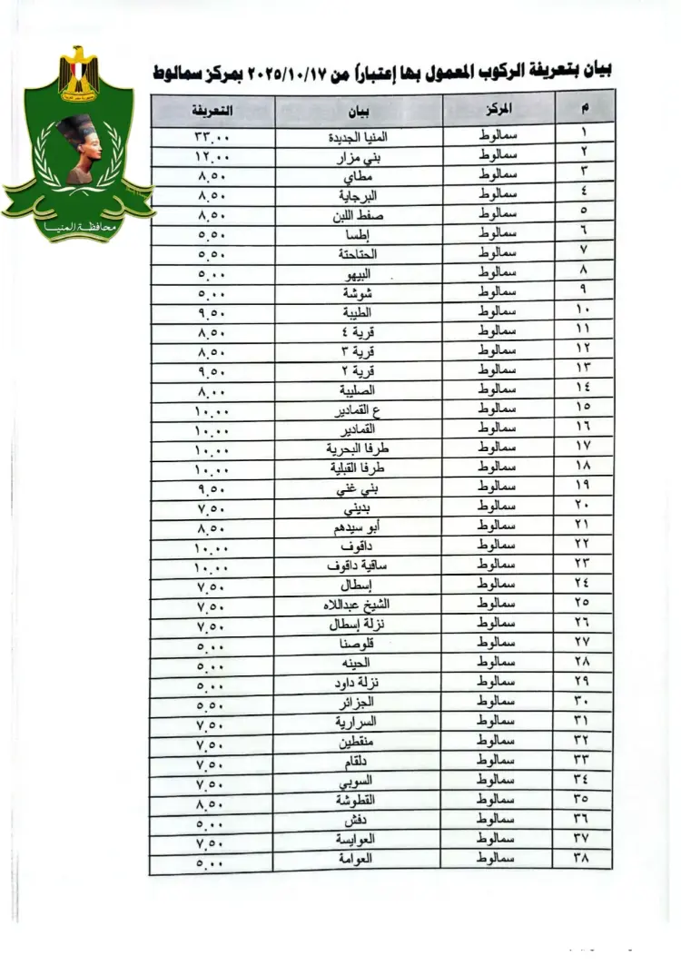 ننشر تعريفة الركوب الجديدة بالمنيا بعد زيادة أكتوبر 2025، حتى تتعرف على الأجرة لجميع المناطق المختلفة.