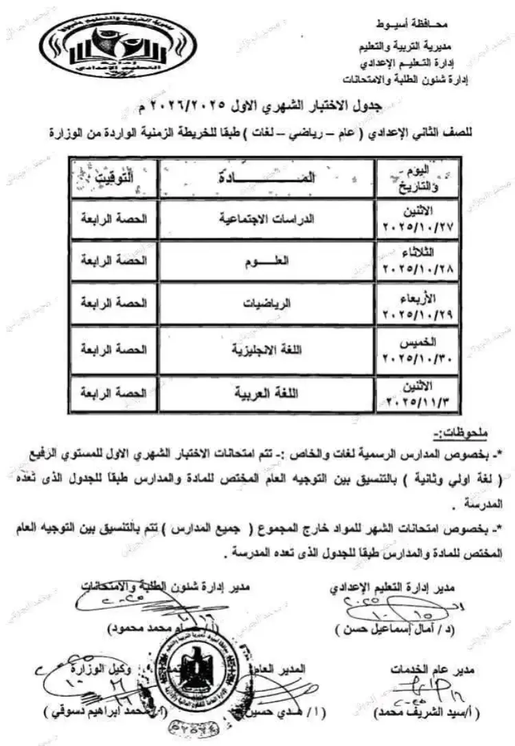 جدول امتحانات شهر أكتوبر للصف الثاني الإعدادي محافظة أسيوط 2025