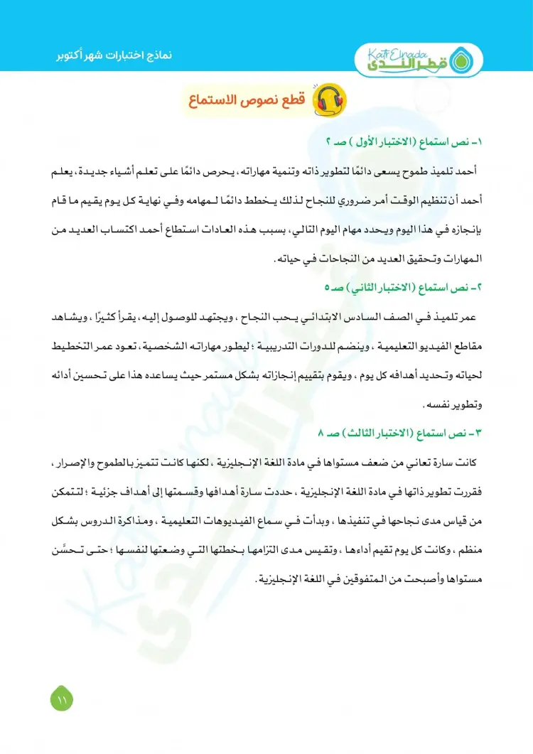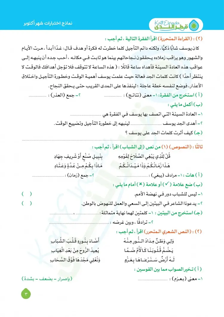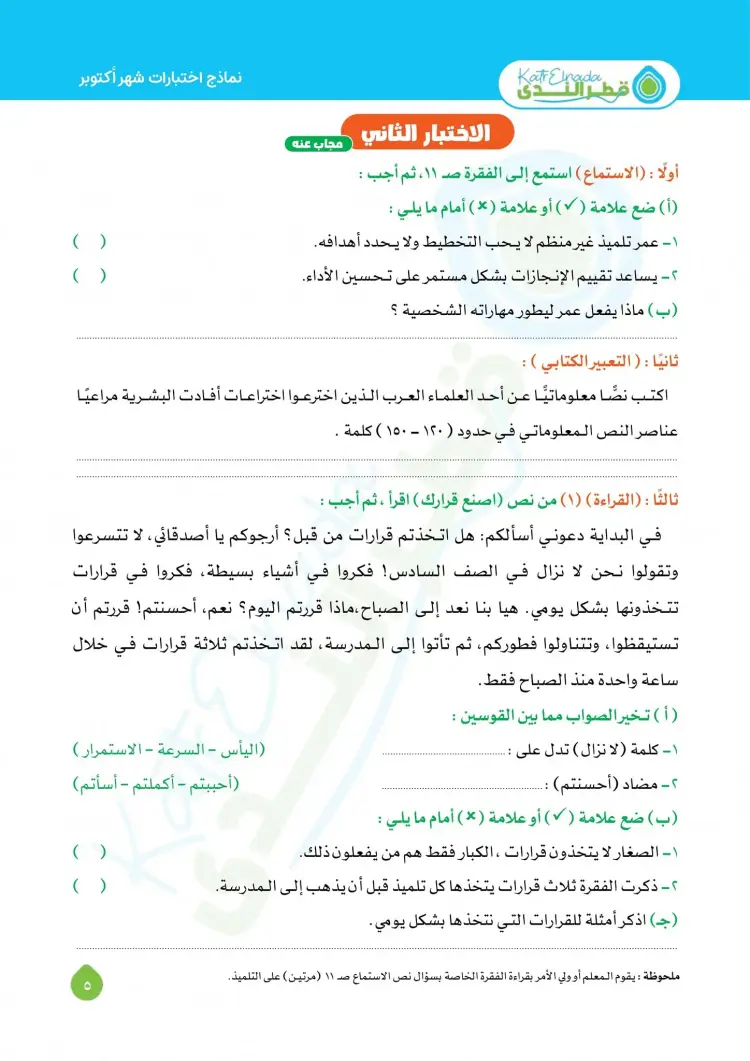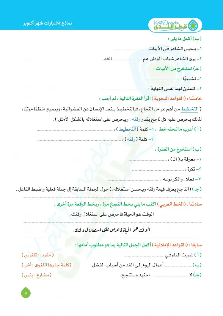 نماذج امتحانات شهر أكتوبر عربي الصف السادس الابتدائي 2025 بالإجابات