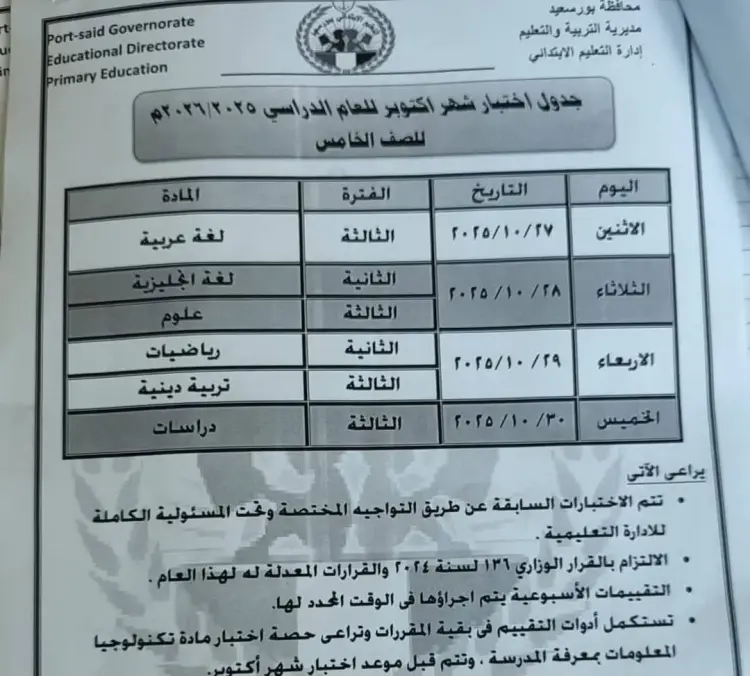 جدول امتحانات شهر أكتوبر خامسة ابتدائي بورسعيد 2025