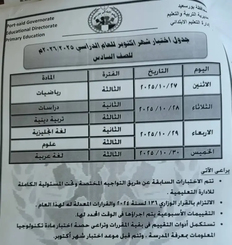 جدول اختبار شهر أكتوبر الصف السادس الابتدائي بمحافظة بورسعيد 2025