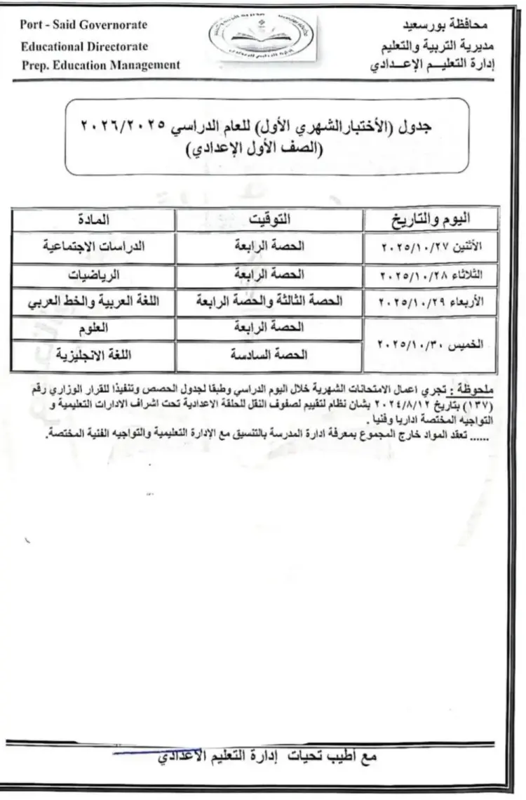 جدول امتحانات شهر أكتوبر أولى إعدادي بورسعيد 2025