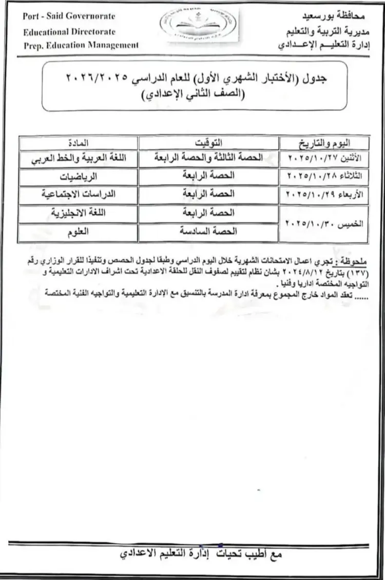 جاء جدول امتحانات شهر أكتوبر للصف الثاني الإعدادي محافظة بورسعيد 2025 على النحو التالي: