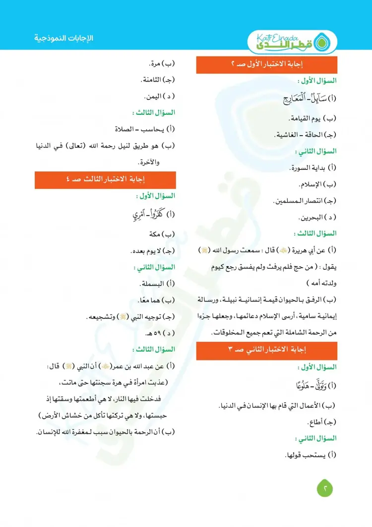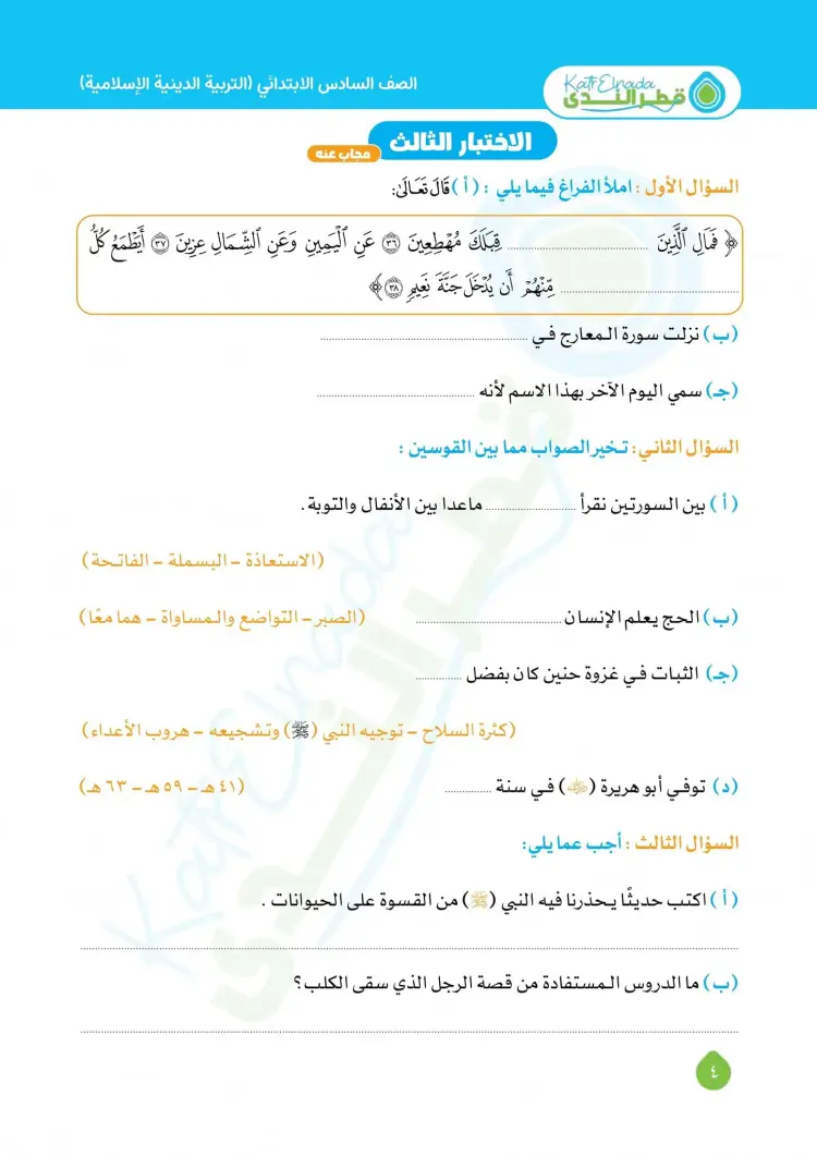 جاءت أسئلة نماذج امتحانات شهر أكتوبر دين الصف السادس الابتدائي 2025 على النحو التالي:
