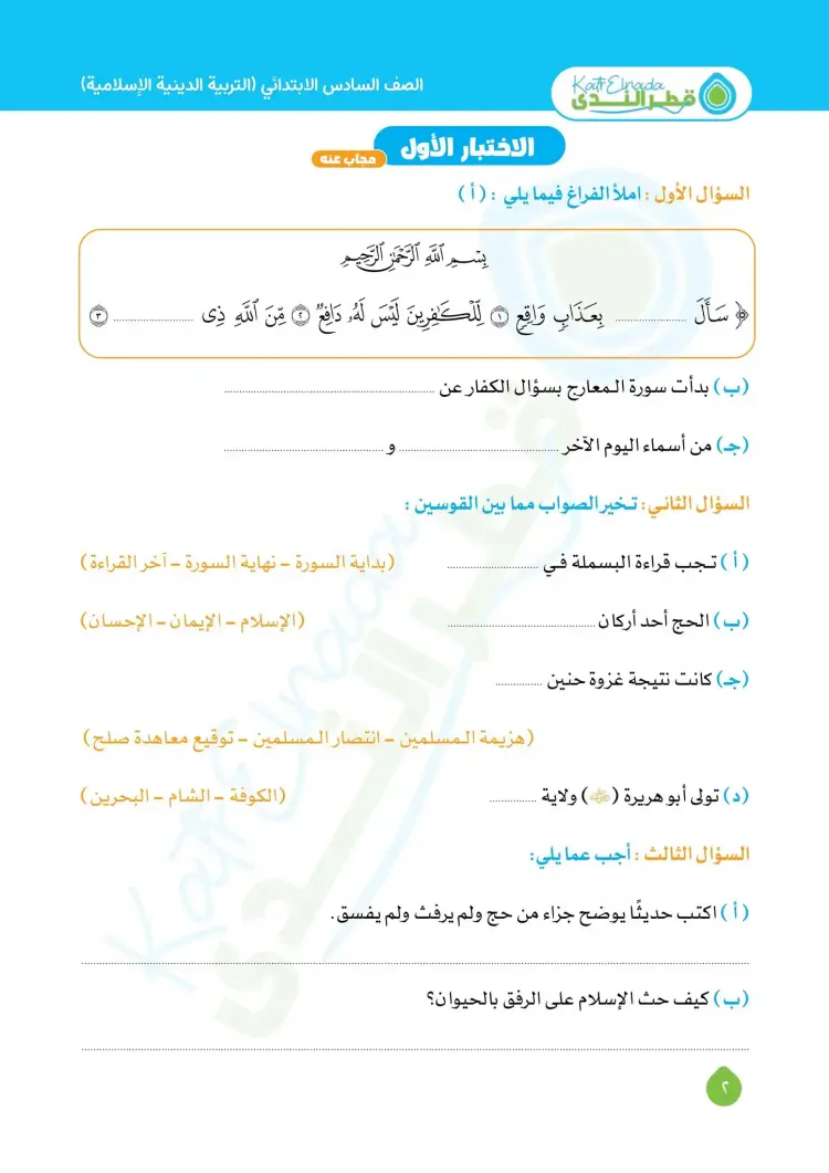 نماذج امتحانات شهر أكتوبر دين الصف السادس الابتدائي 2025 بالإجابات