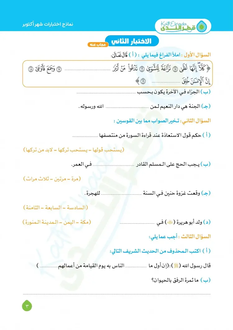 نماذج امتحانات تربية دينية شهر أكتوبر الصف السادس 2025