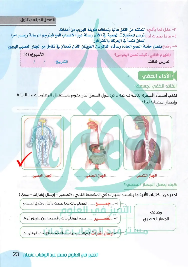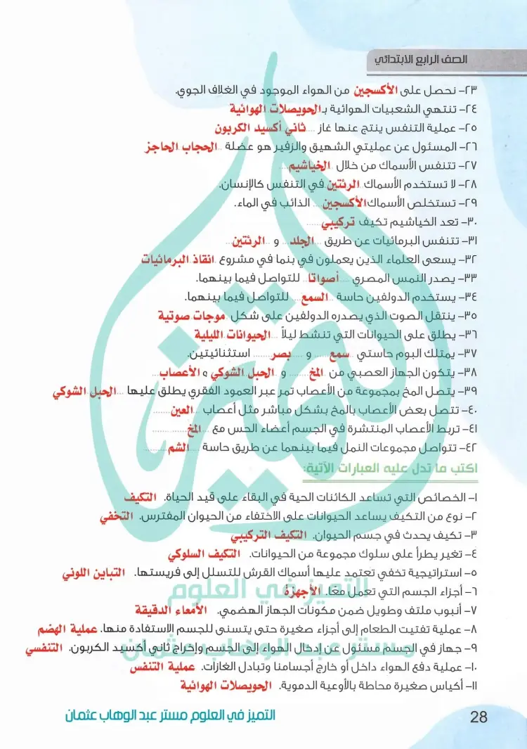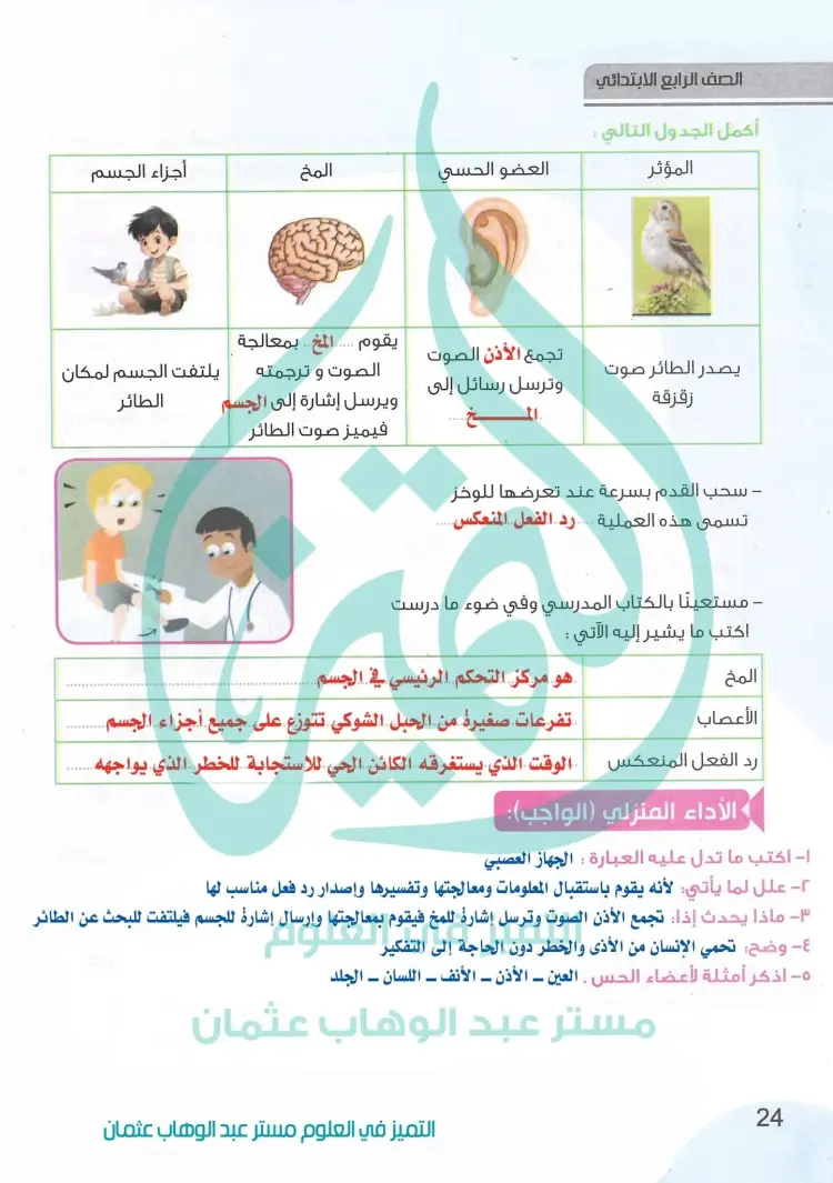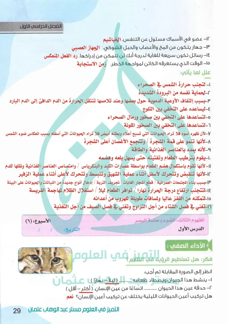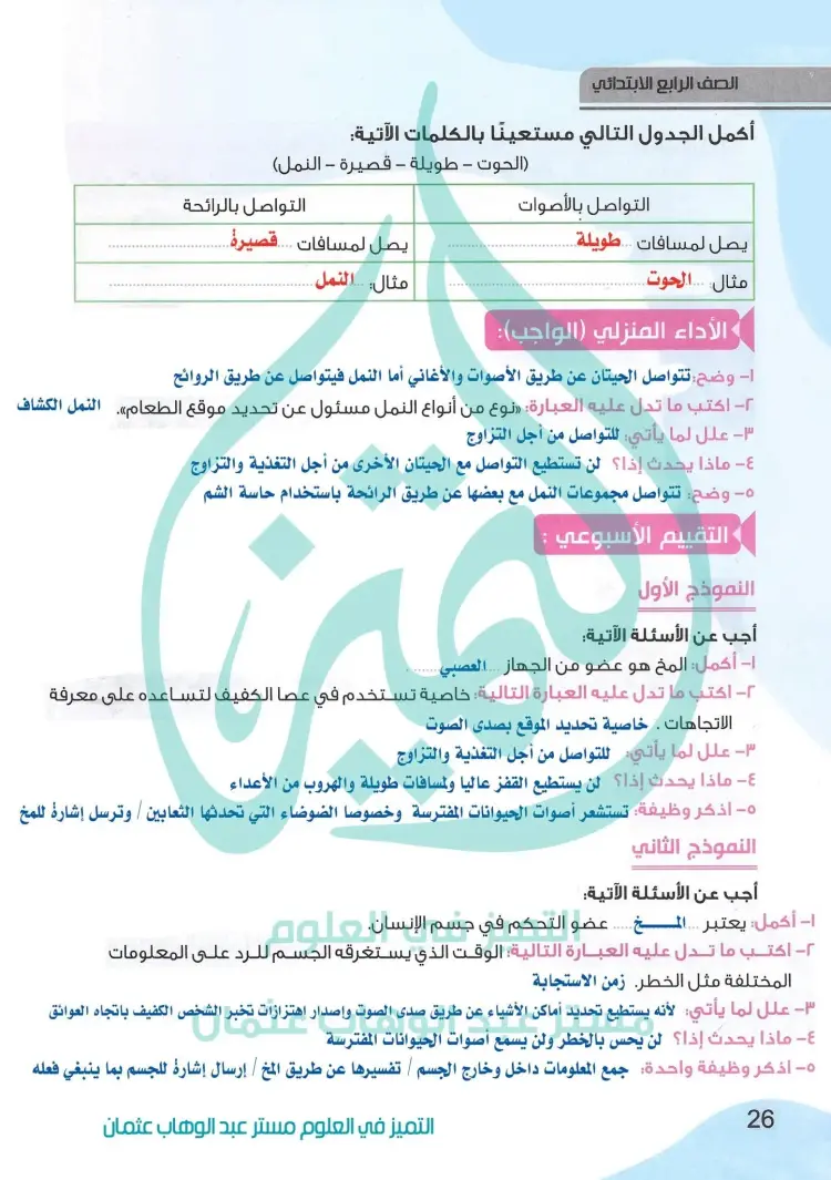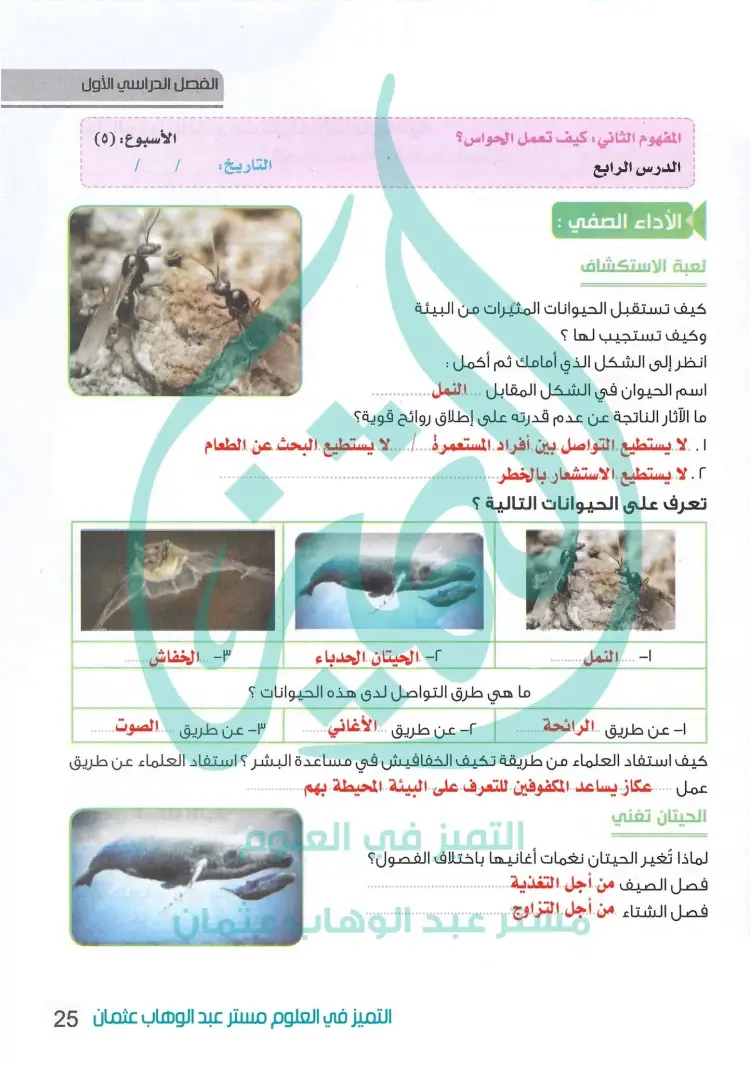 حل الأداء الصفي وواجب وتقييم الأسبوع الخامس علوم للصف الرابع الابتدائي ترم أول 2026