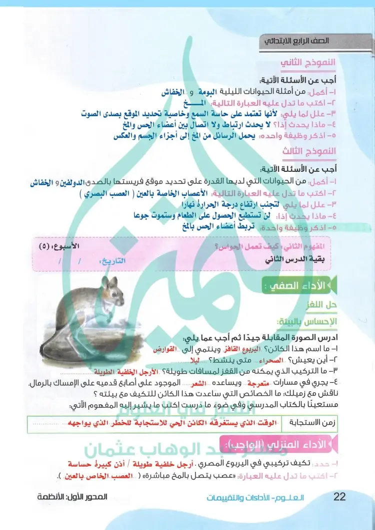 ناقش: ما الخصائص التي ساعدت هذا الكائن للتكيف مع بيئته؟ (المفهوم الذي يشير إليه السؤال) الخصائص التكيفية (مثل الأذنين الكبيرتين لحاسة السمع القوية، والأرجل الطويلة للقفز السريع، والنشاط الليلي لتجنب الحرارة).