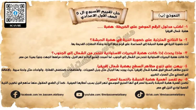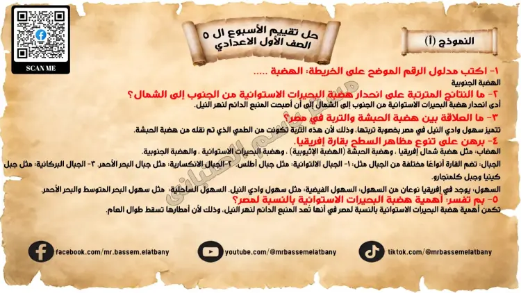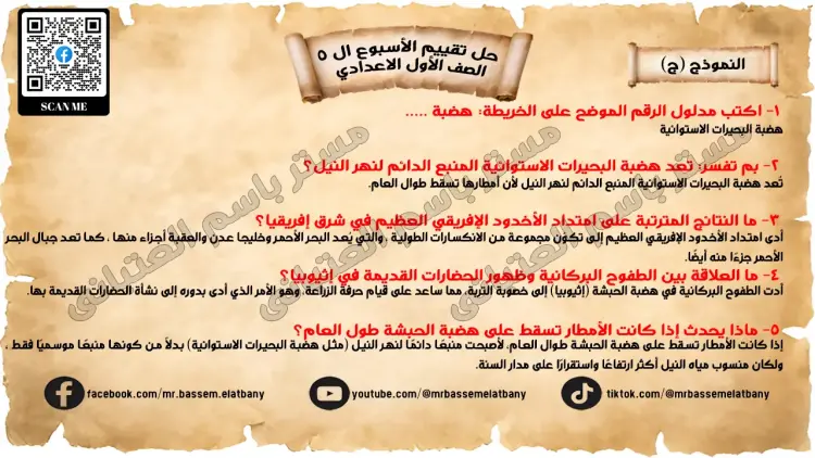 ينشر شبابيك حل الأداء الصفي وواجب وتقييم الأسبوع الخامس دراسات للصف الأول الإعدادي ترم أول 2026.