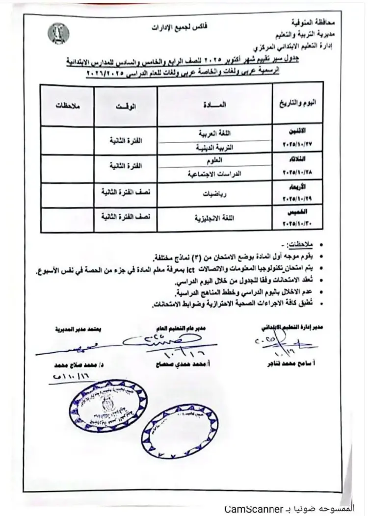جدول امتحانات شهر أكتوبر رابعة ابتدائي المنوفية 2025