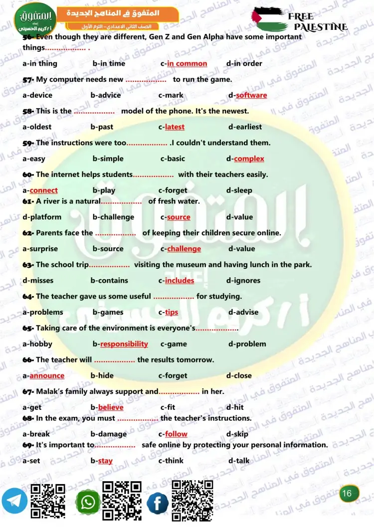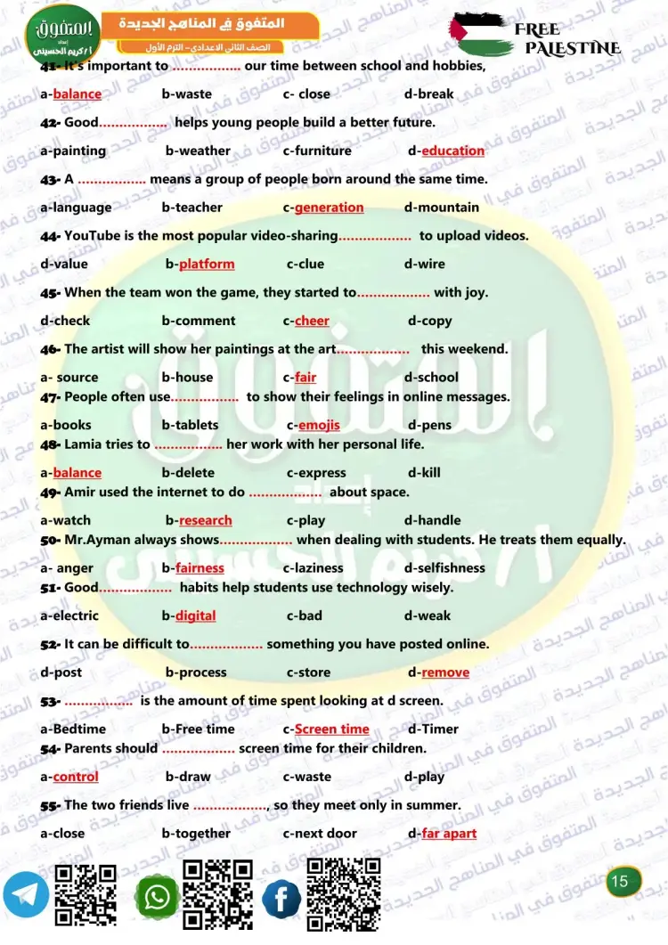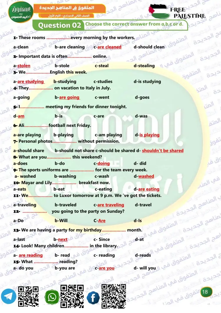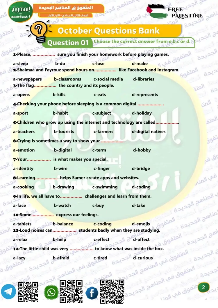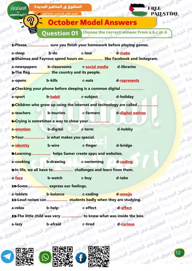 واشتملت مذكرة مراجعة المتفوق لشهر أكتوبر في مادة اللغة الإنجليزية لطلاب الصف الثاني الإعدادي بالترم الأول للعام 2025 2026، على بنك أسئلة متنوع مجاب عنه، منه ما يلي: