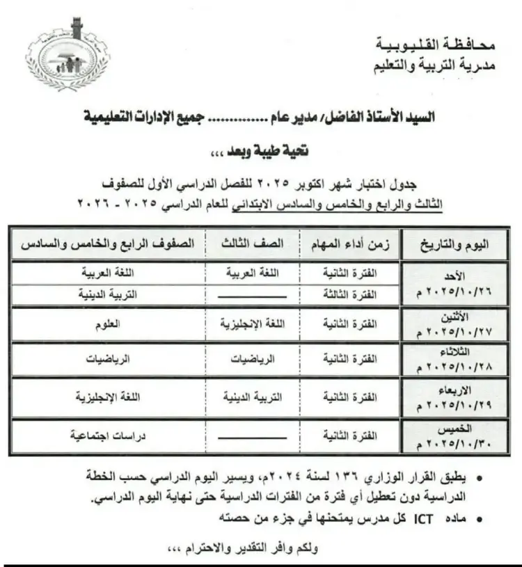 أعلنت مديرية التربية والتعليم بالقليوبية عن جدول اختبار شهر أكتوبر للصف الرابع الابتدائي للعام الدراسي 2025 2026.