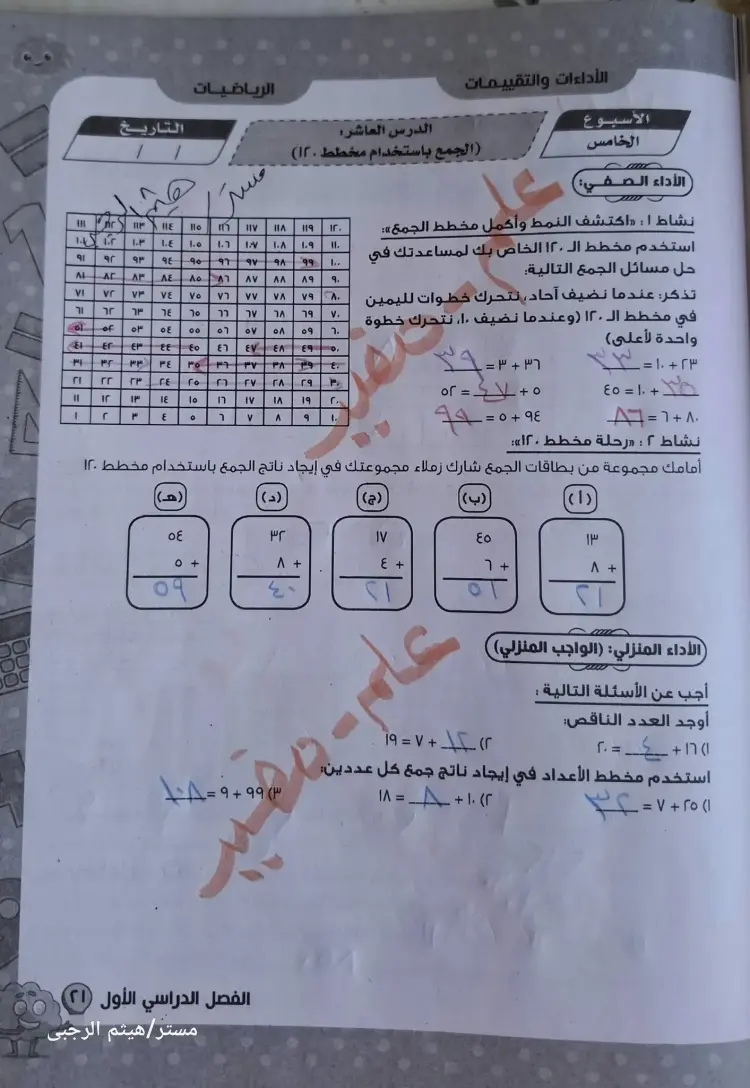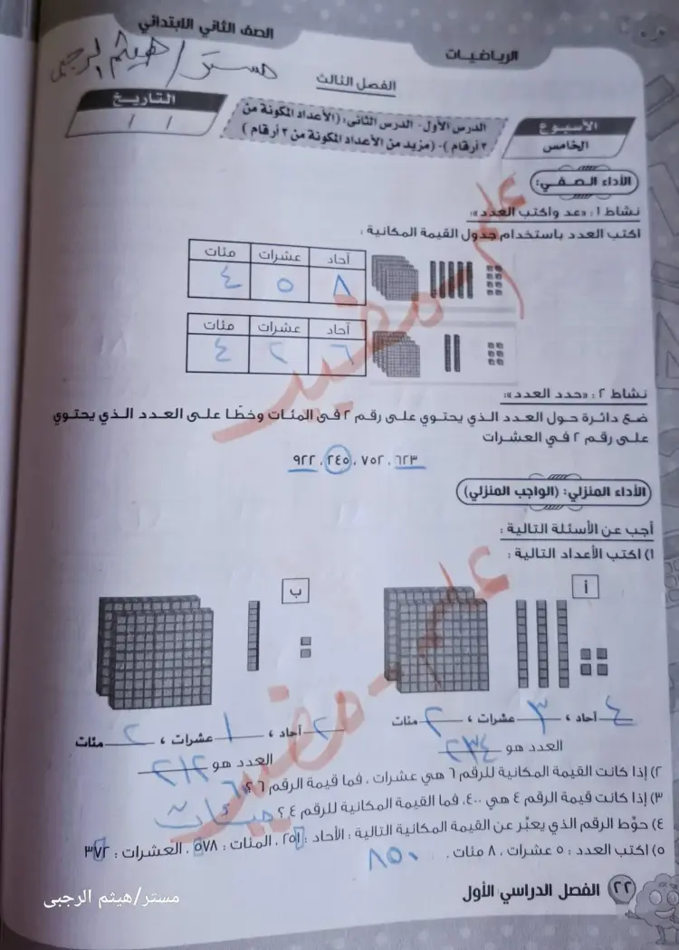 حل الأداء الصفي وواجب وتقييم الأسبوع الخامس رياضيات للصف الثاني الابتدائي ترم أول 2026