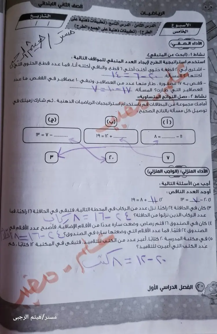 حل الأداء الصفي رياضيات ثانية ابتدائي الأسبوع الخامس ترم أول 2026