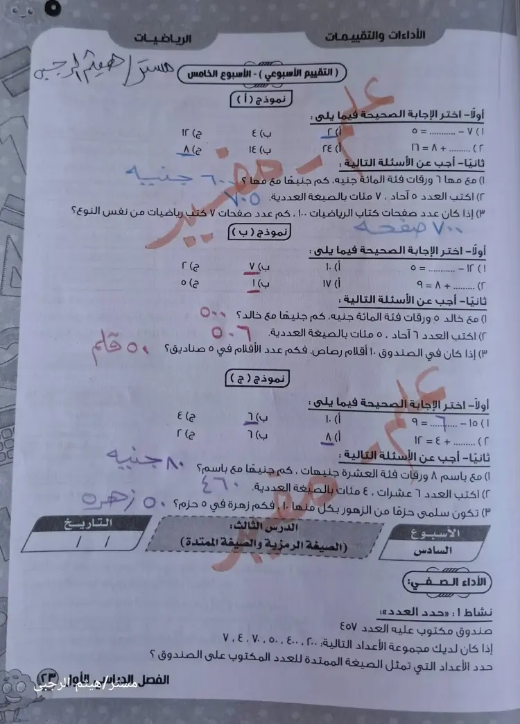 لمتابعة باقي الأسئلة وحل الأداء الصفي وواجب وتقييم الأسبوع الخامس رياضيات للصف الثاني الابتدائي ترم أول 2026 يمكنك الإطلاع على الصور التالية: